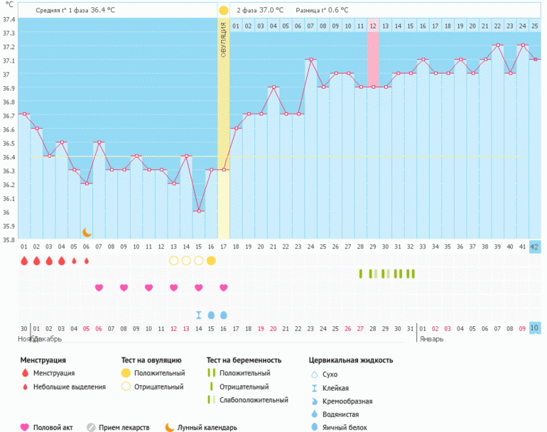 Схожая ситуация, с 25-26 января была овуляция,что подтверждается тестами и ощущениями (тянуло правый яичник), 26-го темпа упала с 36,6 до 36,5, после поднялась до 36,7,держалась по вчерашний день,а сегодня произошло повышение до 36,9. При всем при этом сделала вчера узи, врач сказал,что желтого тела нет, жидкости тоже, но имеются два доминантных фолликула помимо маленьких в левом (до 15мм) и правом (до 17мм) яичнике. У меня мультифолликулярные яичники много лет если что( В итоге Овуляция по моим ощущениям произошла на 28 ДЦ, сам цикл составляет 40 дней. У меня и с первой беременностью был совершенно странный график БТ. Теперь вот думаю чего ждать в феврале?