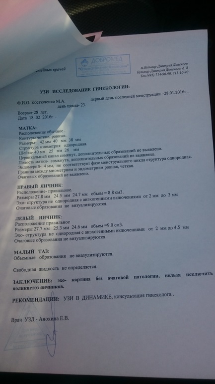 Делала в этом цикле УЗИ три раза (на 6 дц, на 13 дц и вот на 23), с каждым разом поликистоз увеличивался, вернулся. А покидал он меня на пол цикла благодаря сильно повышенному прогестерону, в следствии О на 5 дц).