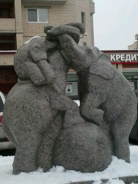 Лягухи, аисты, чихи, приметыДобрый вечер. Мы с дочкой были в музее, и там показывали видео ролик о том какие есть памятники, в нашем городе и области, животным.Показали там семью слонов они мне очень запали в душу. И я все думала погуглить и узнать где они, а сегодня просто по пути на учебу в новое место случайно увидела их, не искала, не знала,что они там. Как будто они сами меня нашли. И появилось огромное желание погладить их малыша, будто это может помочь появиться и моему малышу. Пол часа ждала пока ворота откроются в этот двор. Но все ж я это сделала. Чекнутая, или правда на знак похоже? )))))