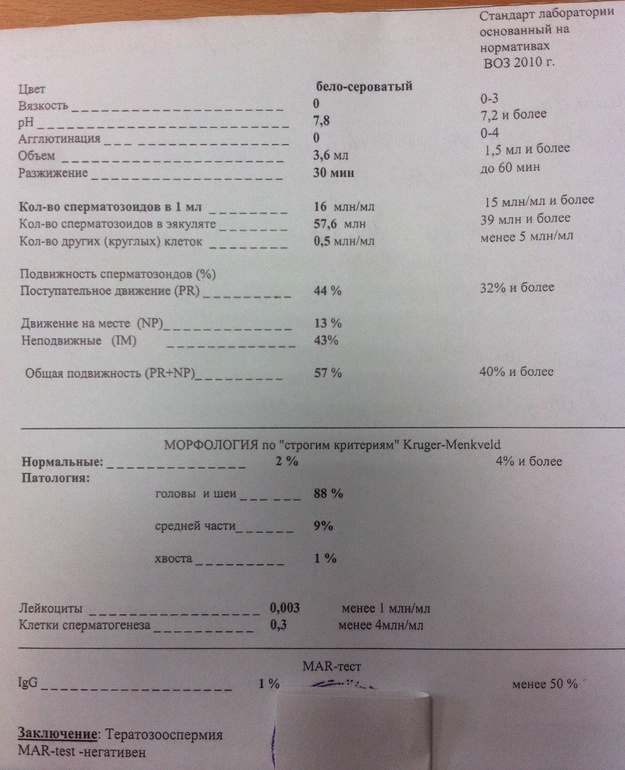 Вот и у нас 4-5 дней небыло до сдачи сг. Нам потом сказали что это много и мол головы громадные у спермиков. Поэтому поставили патологию головы. После мы как-то забили на его сг и я занималась своим лечением. Просто от воздержания сама спермальная жидкость грустая(большинство в ней и погибают), и сами сперматозоиды уже непригодны к оплодотворению . Нам сказали что непригодные один хрен не доберутся до цели)