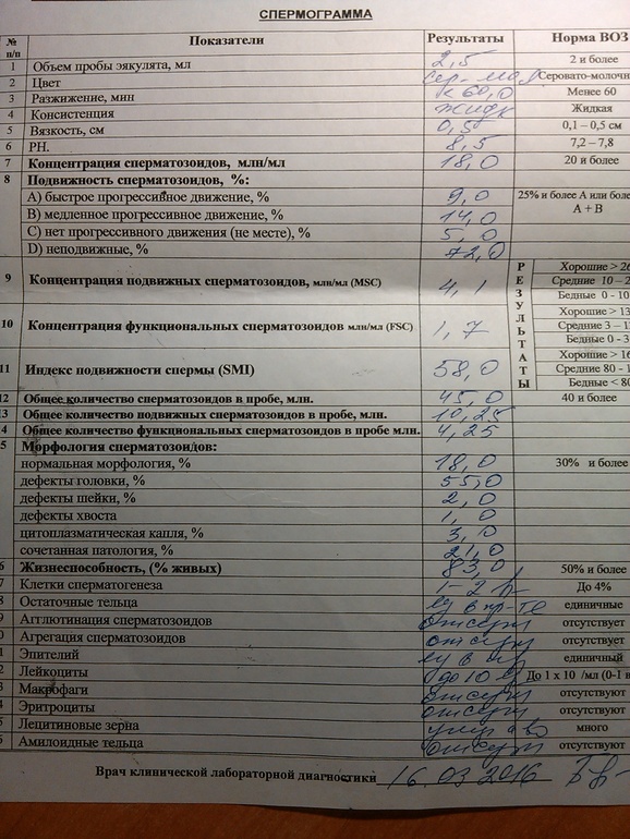 Здравствуйте, девочки! Наконец-то заставила мужа (спустя 2 месяца) сдать спермограмму. Получили результаты. Записаться к урологу хорошему удалось лишь на 21 апреля... До этого так долго...А посмотрев в интернете я ужаснулась нашим результатам...неужели всё так плохо???