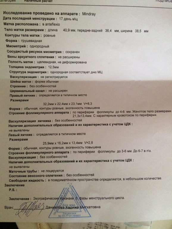 Овуляция была несколько дней назад. Об это свидетельствует как жидкость позади матки, так и полноценное желтое тело с кровотоком. Эндометрий также достаточно пышный.