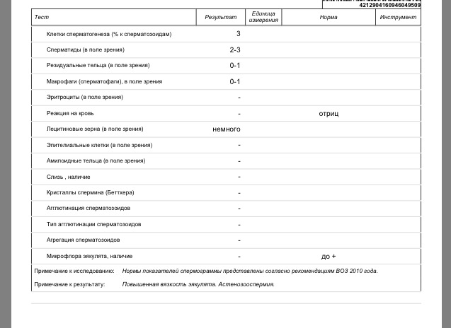 Сперма не прям плохая, но повышена вязкость. Проблема, судя по всему, в простате. Какое-то воспаление. Из-за этого и вязкость повышена. Лейкоциты есть, клетки сперматогенеза, сперматиды.. Надо бы к урологу на УЗИ простаты и сдпть сок простаты на посев с антибиотикограммой. Пропьет препараты от воспаления + витаминки и всё у него наладится. Ничего страшного нет.