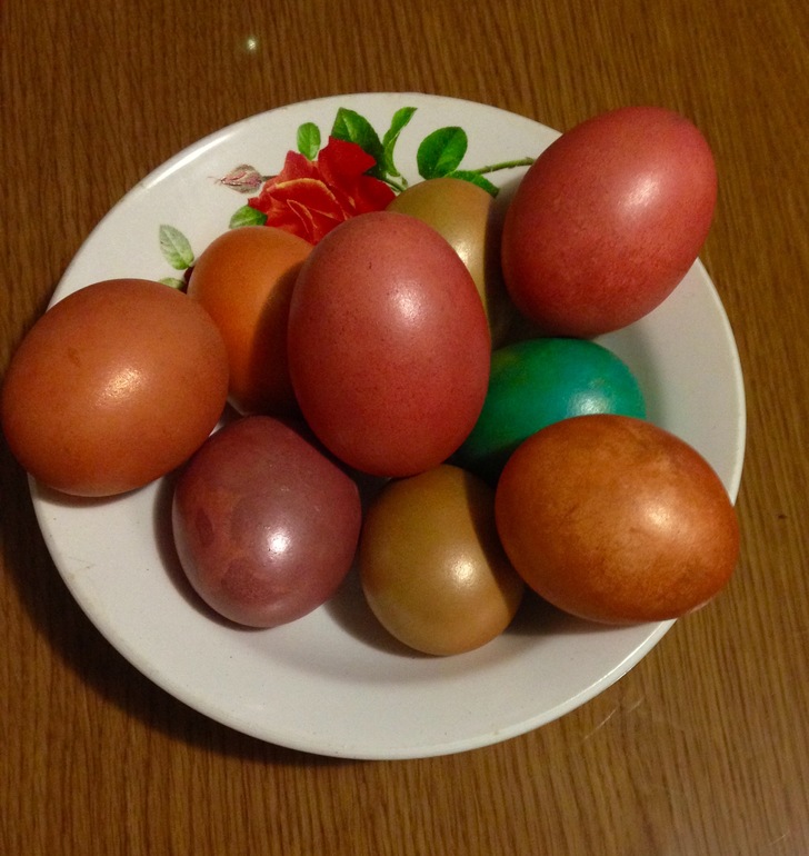 Ага! Эти красили пищевыми красителям, а есть ещё одна большая чашка яиц, крашеных луковой шелухой, бардовые такие))