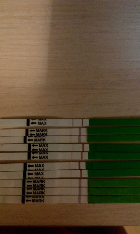 Овуляция( тесты на овуляцию)Пыталась поймать овуляцию тестами купила 2пачки по 5 штук. И только последний 10й тест ярче других, но все равно полоска не такая яркая как контрольная. Получается на 19 д.ц. утром у меня поярчала полоска а на 20 д.ц. (Сегодня) утром я сделала узи и там уже желтое тело. Па были на 12,15,18 дни. Как думаете есть шанс? И когда она все таки была вчера или сегодня? Надо наверное сегодня еще постараться, вдруг сегодня только лопнул фолик, правильно? Яйцеклетка сколько живет сутки? Я вообще не ожидала что меня обрадуют на узи, спкя всегда ставили и по узи никогда не видели овуляции. Фото тестов