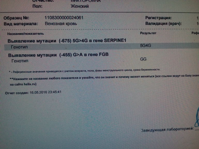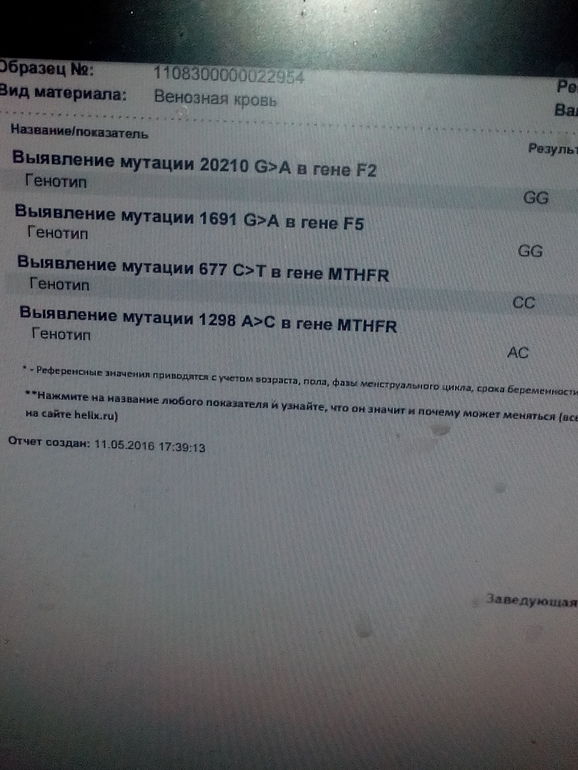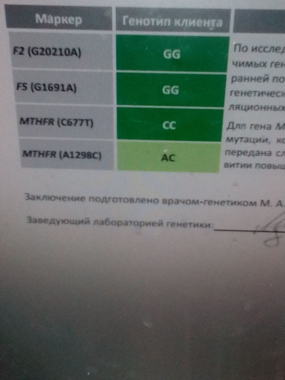 А почему нет мутации Pai, FGB. Ваша мутация не могла стать причиной зб. Это лишь показывает что у вас фолька плохо усваивается и есть смысл сдать гомоцистеин при такой мутации. А вот Пай какой у вас нет анализа, из за неё и происходят ЗБ