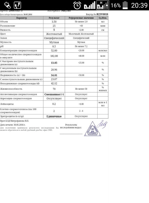 Вязкость большая, а вот подвижность хоть и ниже нормы, но по мне не критичная. У мужа активно-подвижных около 18%, с медленным движением около 22 (правда у нас норма а+b была от 40%, у него получился нижний предел нормы), беременность у меня наступала самое позднее на 2 цикл.