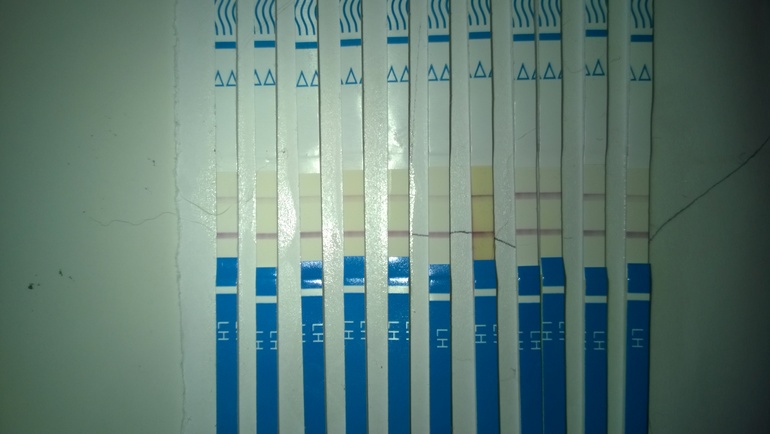 Привет, Катюш! Но дело в том, что самый яркий на фото -это 12 ДЦ, на 13 дц я сходила на УЗИ, и тест в этот день не делала.. На УЗИ мне сказали, что есть жидкость чуть-чуть.. Я ничего не понимаю.. Жалею что не сделала тест на 13 ДЦ, вдруг он был бы самый яркий....