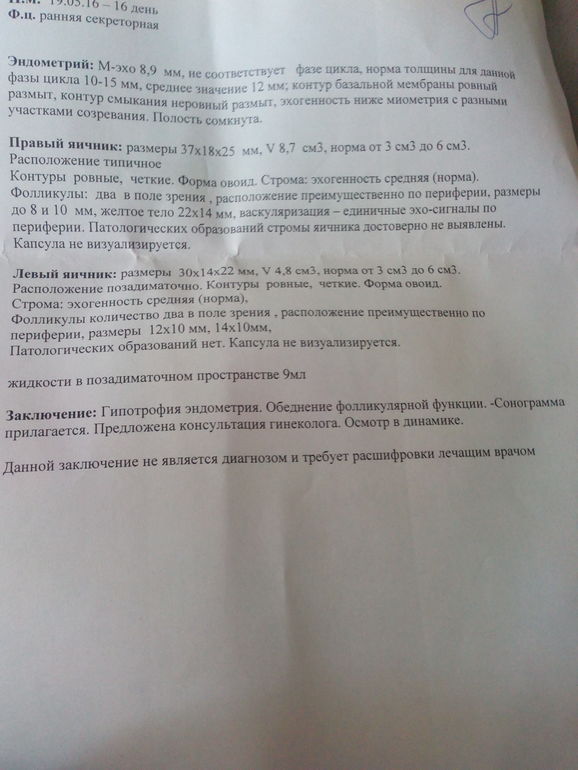 Гипотрофия эндометрия-значит он тонкий, овуляция происходит-но прикрепиться не сможет, нужно чтоб врач корректировал. Плюс в первом абзаце, где эндометрий написано "неоднородной эхогенности". Скорее к врачу, не теряйте время!