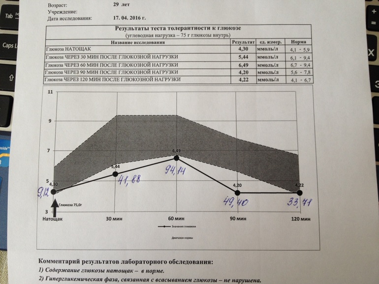 В заключении: отсутствие нарушения толерантности к глюкозе. Но меня очень смущает, что почти все значения ниже нормы. От руки подписала значения инсулина в каждой точке. Норма инсулина натощак - 2,6 - 24,9.