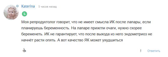 Да, я кстати читала, что прям сразу не стоит беременеть, надо чуть подождать после лапары, могут быть выкидыши. Это печально. А сейчас Вы в ИК?
