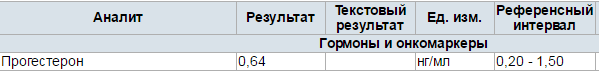 - фаза менструального цикла (фаза желтого тела) - от 1,5 до 22,6 нг/мл
