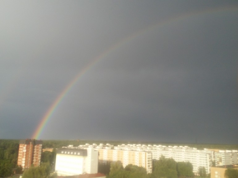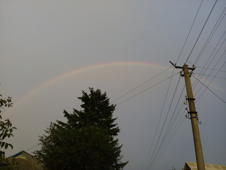я на днях тоже "попала" под радугу.Вечером со старшей дочей за молоком к соседке ходили,а малая мне :Мам смотри две радуги!!!Я посмотрела и впрямь ,обе почти над головой:первая полная от края до края(я такое впервые за свои 39 лет вижу),а вторая выше но на половинку.Красота неописуемая,двойной радуги в жизни не видела!!!
