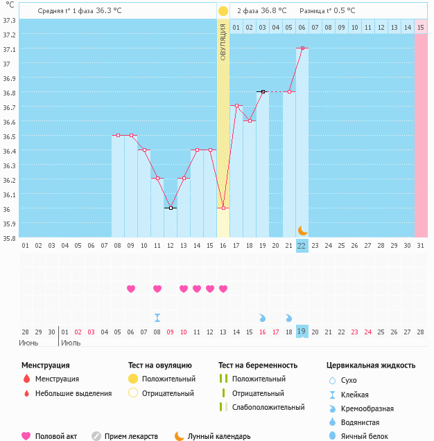 у меня только в этом цикле БТ в первую фазу высокая, раньше такого не замечала...да я тоже в начале цикла была уверена, что все отлично будет, а после овуляции на спад настроение(( боюсь, что не получилось(