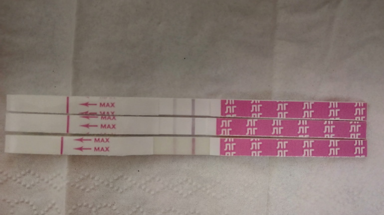 Самый старый тест - наверху. Последний не подсох ещё. Вообще они какие то очень бледные. Даже контрольная полоска появляется ооочень долго.