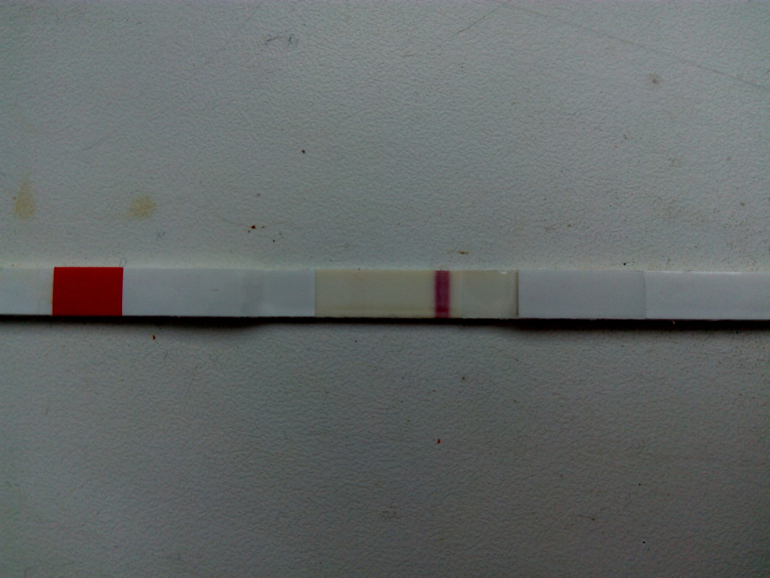 Сегодня с утра я его замочила всё строго по инструкции. Сперва тест был полностью чистый. Потом появилась яркая и сразу видно стало ещё ожну, того же цвета, но гораздо светлее. Всё это произошло не позднее 5 минут. После 15 минут полоска стала гораздо светлее, чем была сначала. (Фото без затемнения).