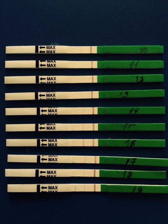 1) На фото тесты на овуляцию - делала 10 дней подряд. 16 день ярче всех, но по сравнению с основной полоской бледно. Это как понять? Что-то есть? И т.е. сразу в этот день с мужем бежать или какое то время выждать.