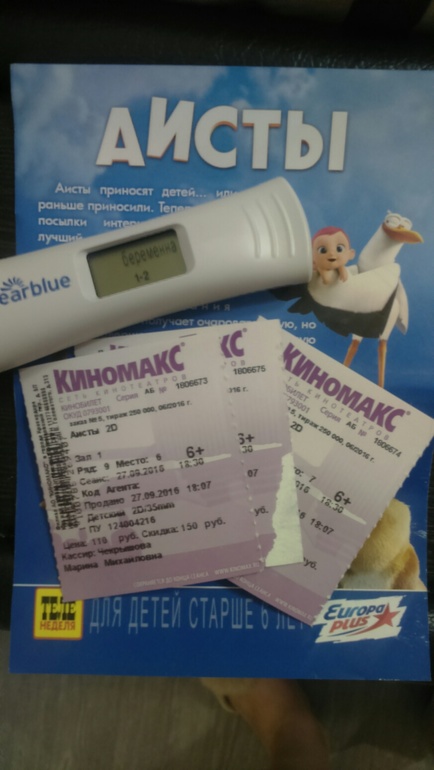 Завела их в кино, даю мужу флаер с листовочкой Аистов, билеты и электронный тест))) говорю: "тут Аисты прилетели, тебе подарочек оставили!"