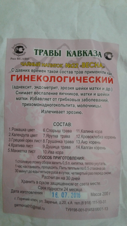 У меня такой же только называется "Сбор при женском бесплодии". Не успела начать приём, т.к. посадили меня на ок на 3 месяца. Если до зимы не получится. то подключу травки.