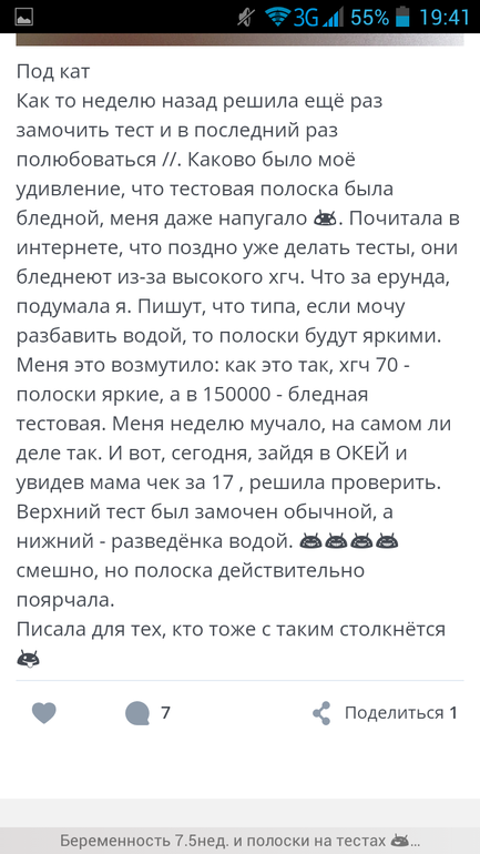 Не за что, только не волнуйтесь, вам нельзя, но я уверена, что все у вас хорошо будет) вот вам с форума еше девочка эксперимент ставила на 7,5 неделях с бледной полоской тест с обычной мочой, с яркой- моча разведенная с водой