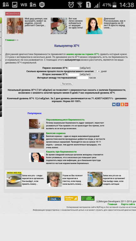 Во, нашла - предполагаемый день М хгч-13,3, через 2 дня=50, через ещё 3 дня =389, через ещё 3 дня 1390, +3 дня=3657, ну не буду грузить, вот 7 недель 2 дня=-63700. выгоняйте таракана тапком!:) нечего ему у вас гостить в мозгах:)
