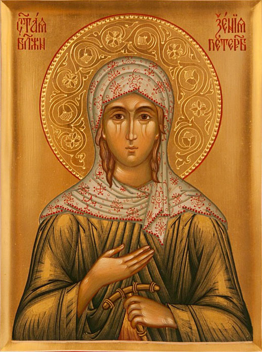 Днесь светло ликует град святаго Петра, яко множество скорбящих обретает утешение, на твоя молитвы надеющеся, Ксение всеблаженная, ты бо еси граду сему похвало и утверждение.