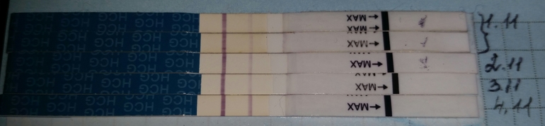 Неясный генезЗадержка 3 дня, тесты полосатятся, надеюсь, что Б есть)) Но мне кажется , что динамики нету (( И почему-то на использованных тестах, спустя день, полосочка становится немного тускнее.. Очень боюсь ЗБ и внематочной ((( Вот фото в динамике (первые два сделаны в один день)