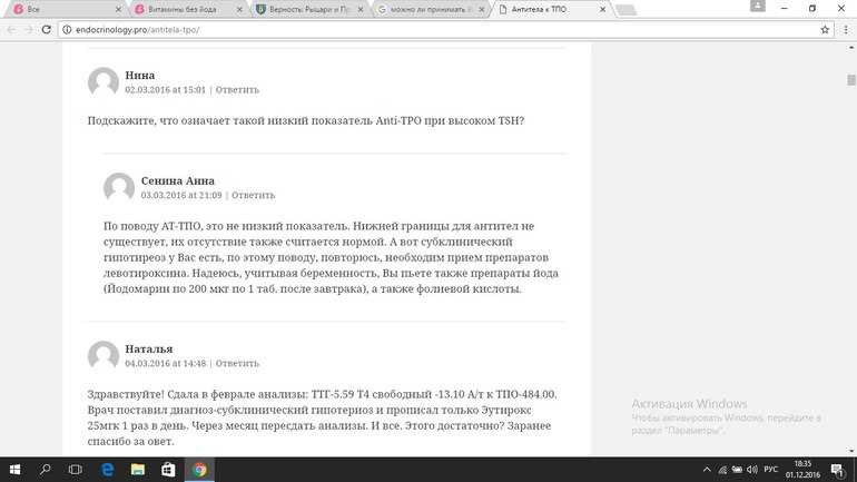 очень похоже на мою картину.... так как ттг в пределах нормы, но присутствуют антитела, то как раз и можно начать с витаминок. йодбалас, йодомарин или фолио - там еще йод с фолькой, она лишней при планировании точно не будет. я все эти препараты пила по очереди, остановилась на фолио - дозировка норм, 500 р на 5 мес флакона хватает. выгодно по стоимости ) ат-к тпо - можете больше не сдавать. если они есть, то никуда уже не денутся. единственое, что от их увеличения может сильнее проявиться воспаление щитовидки, которое отлично видно на узи при цветном доплеровском картировании (так красиво, залюбуешься.. ) пьете витаминки месяц, сдаете ттг. при этом обязательно стараятесь соблюдать одну и ту же подготовку, вплоть до времени сдачи! это очень важно. несмотря, что сам гормон меняется долго (при его изменении витаминами или гормонами уровень проверяют не чаще, чем раз в месяц, а при контроле удовлетворительного уровня - раз в три месяца), он может скакануть вверх только от того, что человек перед сдачей покурил, к примеру. или вечером скушал жареного цыпленка. вот. если его уровень останется таким же, как сейчас, то от йода вам лично и пользы особо нету. (как вот у меня, собственно) но при наступившей беременности йод все равно нужно будет принимать - это уже для ребенка. чтобы его эндокринная система сформировалась правильно. а если ваш ттг снизится примерно на 0,8-1,0 от вот этого уровня на картинке, то йод вам помогает. продолжите его еще на месяц и снова сдадите. ну там дальше все понятно вроде... если уровень прежний или растет - тогда (как мне коллега посоветовала, она сама гинеколог-эндокринолог, такие специалисты крайне редко у нас встречаются в городе) нужно начинать принимать препараты на небольшой дозе, которую вам врач должен рассчитать. я начинала в 50 ед. сейчас 125 принимаю. в учет идет: вес, уровень гормона, и беременна /небеременна. там по коэффициенту как-то рассчитывается, точно не смогу сказать... сама эта врач сказала, что можно принимать и больше дозу, организм возьмет столько, сколько нужно. допустим, у меня по рассчету доза должна быть 168 ед. то мне назначат дозу 175 или 200. дозы в 150 ед мне не хватит. вот. чем смогла - помогла, если что не понятно - постараюсь объяснить )