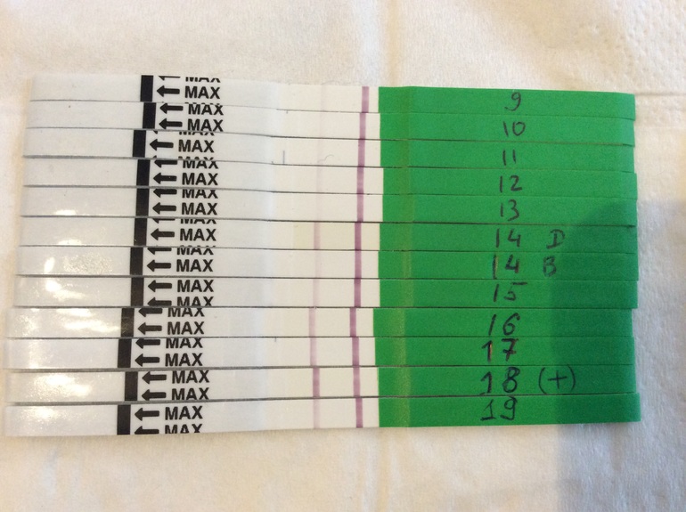 В прошлом цикле первый раз в жизни делала тесты на О (овуплан). Самая яркая полоса на 18дц (клиа блу улыбнулся тоже). Смущает довольно яркая полоска на 14дц, которая вечером и на след день посветлела, а потом опять стала ярчать. Ощущений никаких в О нет, по выделениям тоже не умею определять.