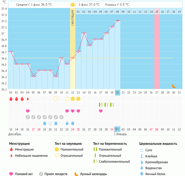 мой график на сегодня. Но я не уверена, что программа правильно выставила О, по моим ощущениям и тестам на О, она была на 17 ДЦ. Тест утром сделала, чист. Но если О была все же на 17 ДЦ, то рановато наверное тесты еще делать..и они у меня очень простые с низкой чувствительностью. Сделала ради интереса на О вчера и сегодня тест (начиталась, что они более чувствительны, и могут раньше Б показать..хотя мне интересно как? это же разные гормоны....). Вообщем хз, но тесты на О нормально заметные полоски нарисовали и вчера и сегодня... Забавно. Подожду пару дней, сделаю ClearBlue который самый чувствительный). Катя, вам удачи!