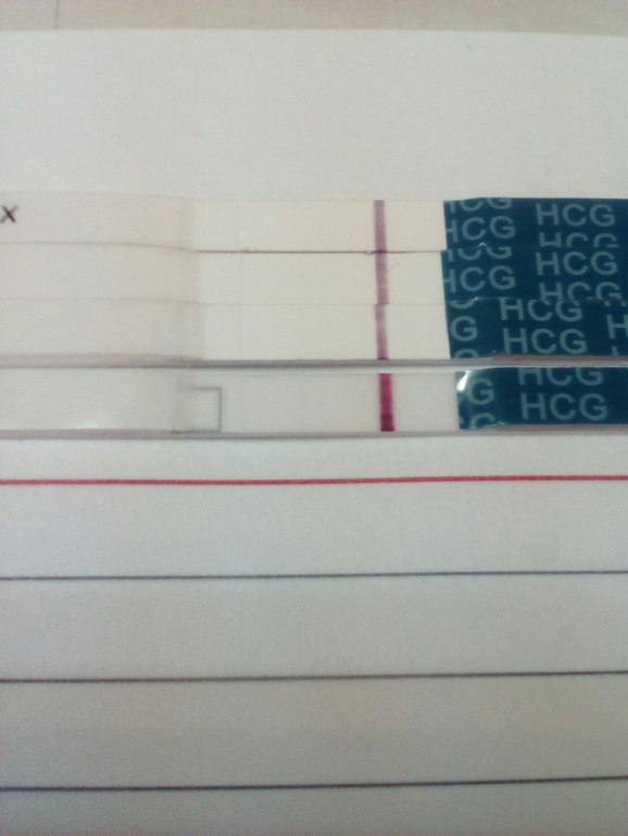 Только на нижнем что-то вижу. Но там затемненно,поэтому может реагентов ярче быть. Надо сфоткать тесты при одинаковом освещении