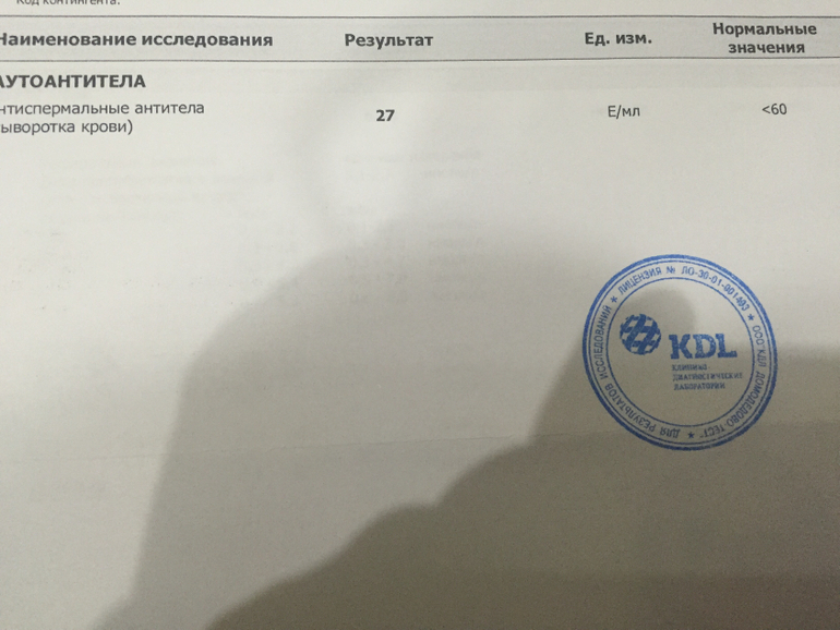 А на антиспермальные антитетела это вы кровь сдавали или посткоитальный тест делали? Или это мужа сперма?
