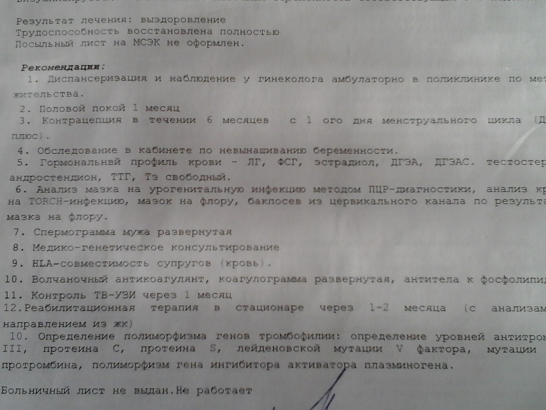 Уже сдала гормоны щитовидки они в норме.Завтра чистка возьмут Эмбрион на гистологию,тромбофлебию сдам после выписки ,ну и афс,фолатный цикл.Что ещё доктор посоветует.