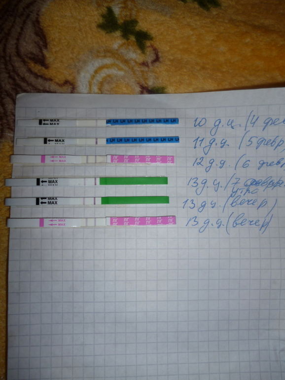 Овуляция( тесты на овуляцию)Девочки, здравствуйте!Я тут погуглила, оказывается после первых двух уколов Бусерелина остается возможность забеременеть, т.к организм еще привыкает к ИК.Ну и решила я тут побаловаться тестами на О.Все еще надеюсь на чудо и не теряю веры.У меня все не как у людей.Думаю, а вдруг получится забеременеть в первые два месяца.Вобщем вот мои тестики, посмотрите пожалуйста.Была ли О или только предстоит?Третий снизу тест сегодняшний утренний, два последних сегодняшние вечерние.