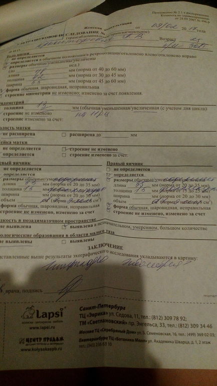 Неужели врачам сложно писать поразборчивее?!! У вас указаны только по два размера яичников, объем посчитать нельзя. Непонятно почему врач этого не сделал. Про фолликулы там написано, только я не могу разобрать( вам на словах что-то говорил узист?