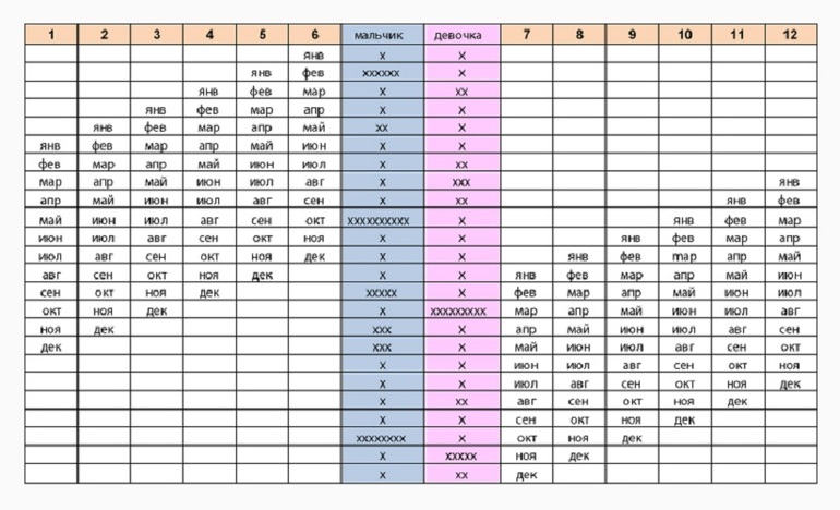 у моих всех знакомых вроде совпадает, а у меня , как ни крути и я должна была родиться у мамы мальчиком и сын должен быть у меня дочкой))) Даже если учесть переходящее зачатие на грани соседних месяцев - все равно девочка, а вот по японской таблице все совпало.