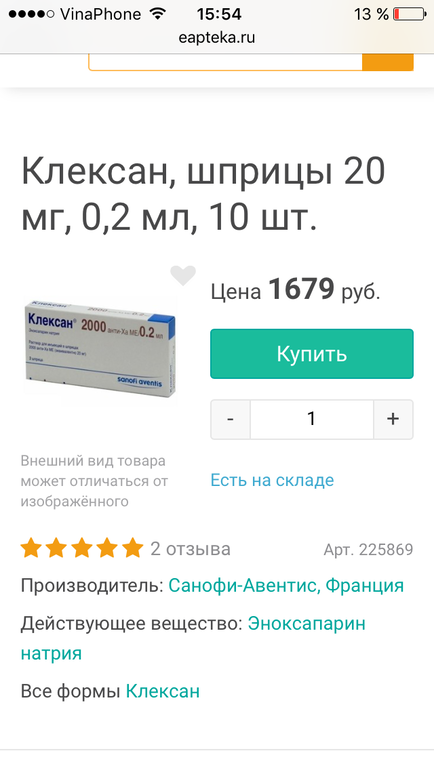 Я вот перевела в российские рубли и посчитала что 1 шприц с уколом клексана 04 стоит 237 рублей. Умножаем на 7 дней в неделю и умножаем на 38 недель (клоть начала после овуляции) и получаю 63000 рублей. Что то у вас дорого выходит. Тем более что доза там меньше. В упаковке там не 2 шприца наверно...у меня в упаковке 10 шприцов. Но так как я не всегда упаковку покупаю, то знаю цену 1 шприца. Аптеки продают их поштучно. Хотя вон на фото явно видно чтт там 2 шприца... странно... очень дорого... может это 2300 не российских рублей? Может беларусских например?