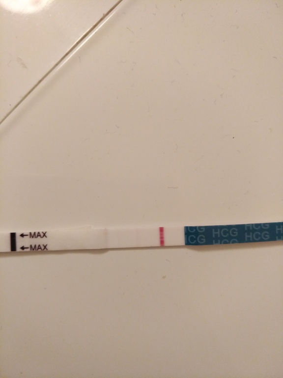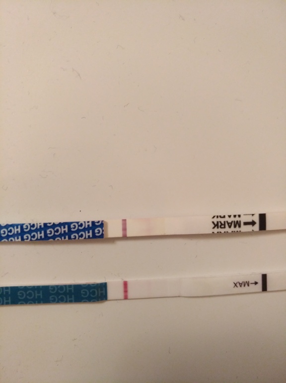 Нижний тест так и появилась, в течение 3-5 минут, а верхний нет.....я верхний выкинула и потом , через час,решила глянуть еще разок и увидела уже//....тогда выдавила пару мл из себя и замочила нижний...и через минут 5 сделала фото обоих