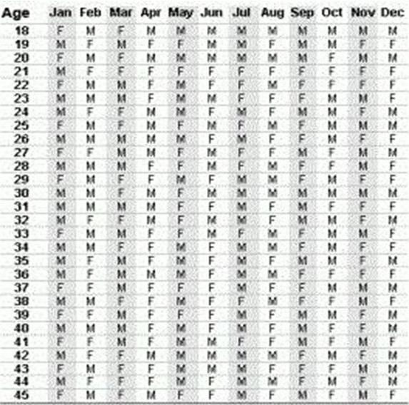 Слева возраст мамы, сверху месяц зачатия))