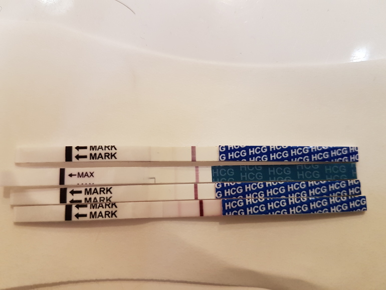 Девочки очень переживаю за динамику тестов. Сейчас 36 дц. Цикл обычно 30 дней. Но в этот раз О была поздняя нв 20-21 день. Т.е сейчас 16 дпо. Посмотрите пожалуйста очень бледные полосочки? Нижний сегодняшний. Далее вверх вчера вечер, утро, и воскресенье день. Боюсь все ли там где надо... скажите а рост хгч если вдруг ( не дай бог )внематочная какой?