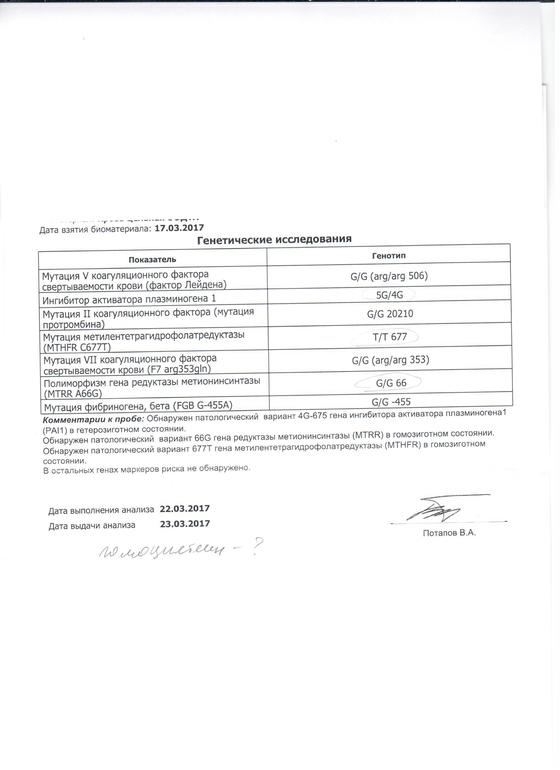 1)Ген ITGA2 результат С/Т гетерозигота2)FXIII (G103T) результат G/T гетерозигота3)PAI1 результат 5G/4G гетерозигота4)MTR (A2756G) ,у меня G/G гомозигота редкий аллель5)MTRR (A66G) результат G/G, гомозигота редкий аллель6)MTHFR(C677T) гетерозигота,результат С/T