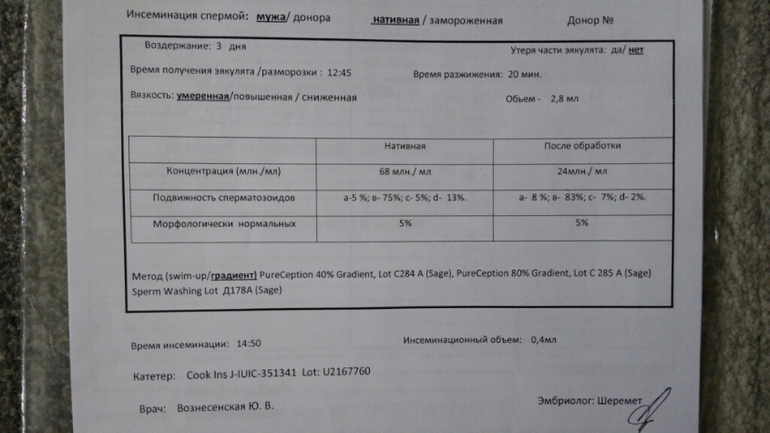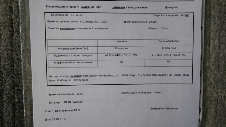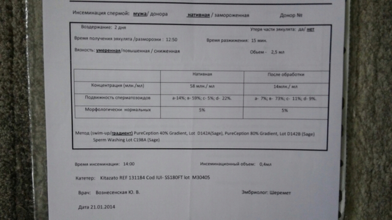Началась подготовка к ЭКО (пункция июнь 2014, криоперенос август 2014). У меня не сохранились данные - начала писать я и решила проверить еще раз свою толстую черную папку))) и бинго - данные по сперме перед пункцией (отдельно СГ нет, там все в одном "Эмбриологическом протоколе" пишут):