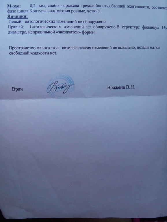 ОвуляциИ не было, я это знаю по своиМ ощущениям. Грудь не изменилась и боли не было со стороны яичника хотя всегда есть. Более того эндометрий трехслойный, а это значит он соответствует первой фазе.