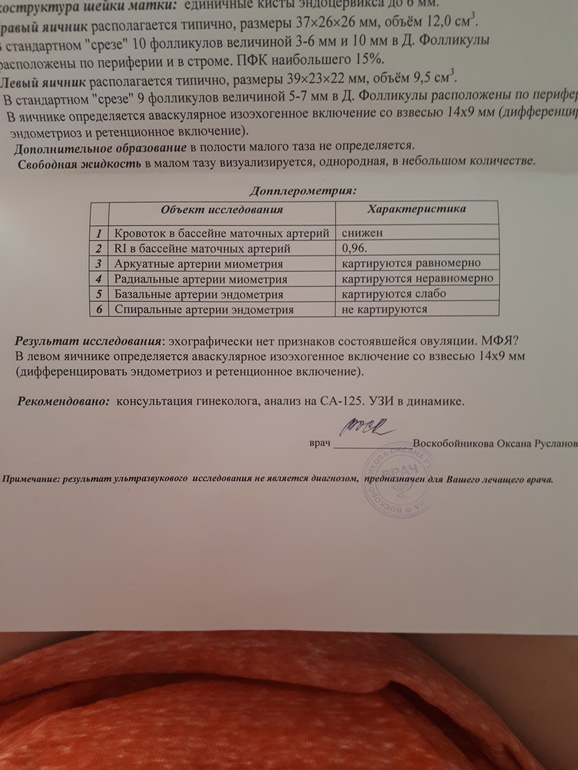 Девочки,выручайте! Сделала узи малого таза на 22ой день цикла. Планирую беременность. Не могу толком понять результат исследования. Анализ СА-125-это анализ на онкомаркеры. Я в ужасе... не знаю,что думать...До приема у врача несколько дней... я с ума сойду за это время! Подскажите,Как правильно трактовать результат исследования и рекомендации.