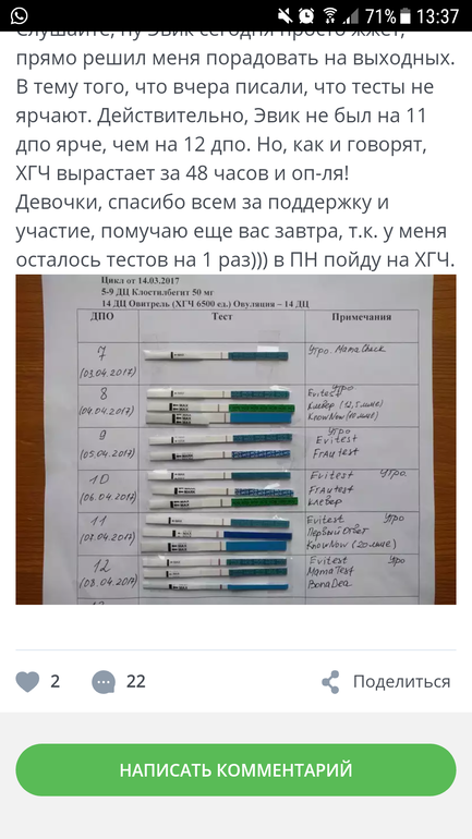 Ждем дня Х (Признаки беременности / Тесты)Слушайте, ну Эвик сегодня просто жжет, прямо решил меня порадовать на выходных. В тему того, что вчера писали, что тесты не ярчают. Действительно, Эвик не был на 11 дпо ярче, чем на 12 дпо. Но, как и говорят, ХГЧ вырастает за 48 часов и оп-ля!