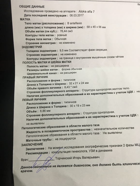 нет в узи от 07 числа написано На момент исследования признаки секреторной фазы мц. мультифолликулярных яичников. Узи от 04 апреля, на момент исследования признаки 2 фазы цикла. На узи от 28 марта, на момент исследования эхографические признаки нормального статуса в малом тазу, соответствуют 2 фазу цикла, косвенные признаки произошедшей овуляции.