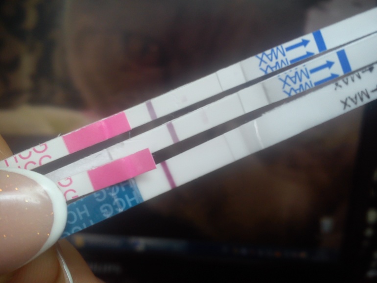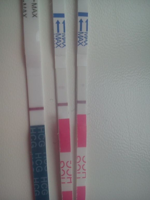 И вот что мне он выдал (верхний) - просто точка. Я через время делаю еще один, и уже полполоски....естественно - надо бежать за третим, я бегом за Эвиком - а там дуля....может потому что быстро это все (за 3 часа 3 раза пописяла и 3 теста сделала)
