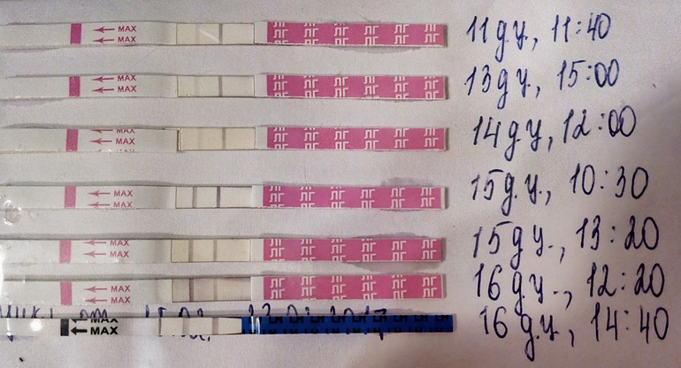 Вот у меня тесты момент чуда, четвертый снизу, положительный, он сделан с утра, а следующий вечером.