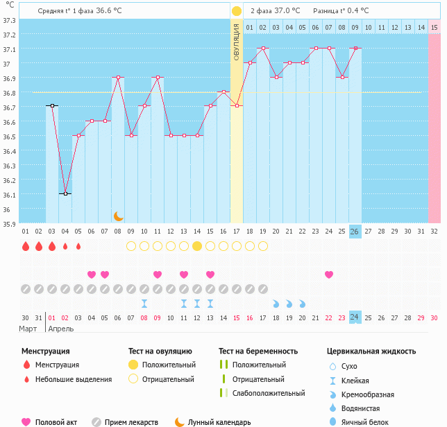 Приложение "Графики базальной температуры", ведутся от начала цикла, видно разницу 1 и 2 фазы. Лично у меня за 1 день до М падает на 0,1... вот жду, когда не будет опускаться ниже 37.0 и ждать задержки))
