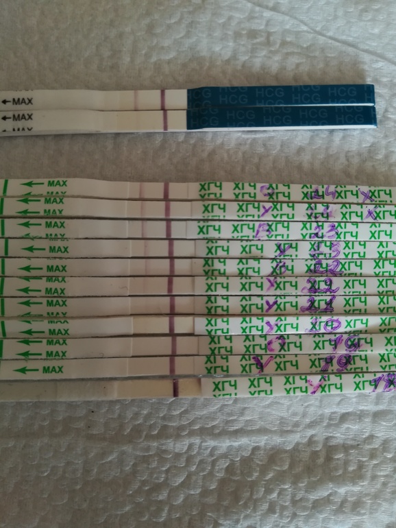 вот мои тесты бишурс. С 8дпо показали полосочку, но очень очень бледную. Самый верхний это сегодня в день Х